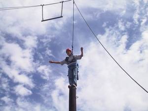 Let's start with the creator of the ropes course here in Mazatlán, please meet Brian Werner, the club manager at the El Cid resort. Brian is in charge of all of the golf, tennis, and other activities associated with the El Cid country club. In 1998, he decided to bring a ropes course to El Cid, and over saw the construction of the equipment and the training of the facilitators. It's been operating since then, and has a perfect safety record. While the equipment is located on the El Cid property, it is a separate venture that is completely under Brian's management. Well, Brian sent me an email in Feb 2000, and asked if I would advertise this venture on my www site. I wrote back telling him that I don't do advertising, but just write about my personal experiences. The net result was that I got roped into doing something that I would probably never have done, at least not without a lot more alcohol in my body. (I am not very fond of heights.) However, it was a great experience and I can honestly say that I'm sure you would enjoy it as well, though the exact meaning of enjoy is a little warped here.